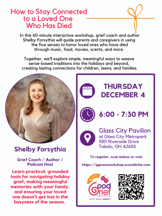 The intersection of grief and the holidays can be overwhelming, but our senses hold powerful keys to memory. In this 60-minute interactive workshop, grief coach and author Shelby Forsythia will guide parents and caregivers in using the five senses to honor loved ones who have died—through music, food, movies, scents, and more. Together, we’ll explore simple, meaningful ways to weave sense-based traditions into the holidays and beyond, creating lasting connections for children, teens, and families.